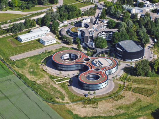鳥瞰已搬到德國加興(Garching)的歐南臺總部,下方的紅色頂建筑和其上方的灰褐色頂建筑為總部主樓,右側(cè)黑色圓形建筑為技術部建筑。左側(cè)方形建筑則是集裝箱搭建的臨時建筑,此前的自適應光學部就占據(jù)此小樓。